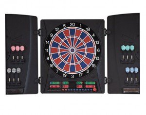 Ausstattung: 4 LED-Anzeigen und digitale, akkustische Signale mit verstellbarer Lautstärke, 12 Pfeile und 24 Ersatzspitzen, Netzadapter, Tastensperre, Spiel gegen Computergegner, 12 Darthalter/Ablage, Wurfberechnung, Bounce Out Option;